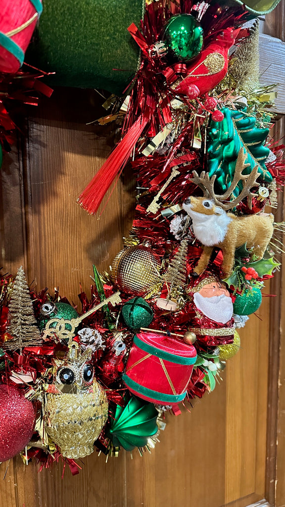 Vintage red robin and velvet drums adorn this darling wreath! Lots of other collected baubles add texture and interest to create a unique Christmas presentation!