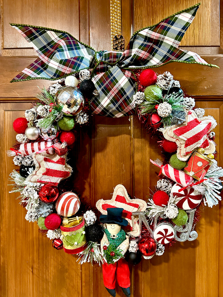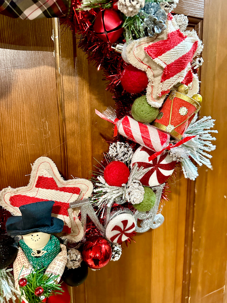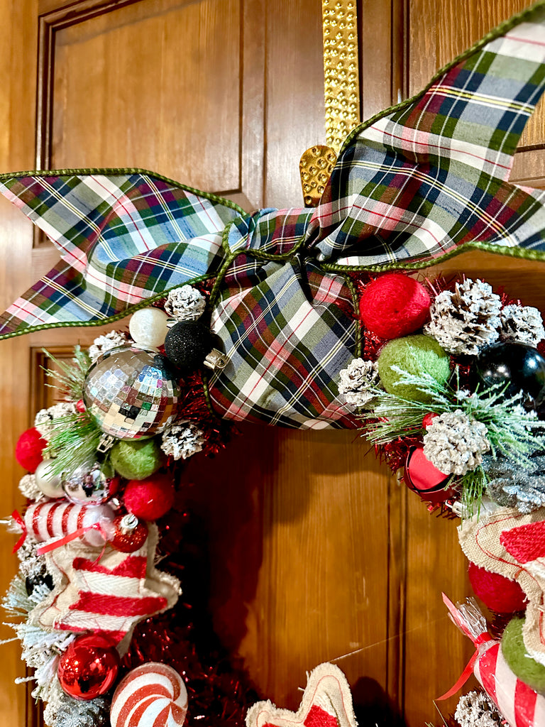 Crafted with expert detail, the Scottish Snowman Bauble Wreath combines classic holiday charm and timeless elegance. Featuring Scottish plaid ribbon intertwined with white glittered pinecones, velvet vintage drums, and a fabric snowman made from vintage material, this wreath captures nostalgic warmth. Accents of fabric stars and faux candy ornaments in traditional red and green complete the festive design, making it a striking and sophisticated decoration for seasonal display. Ideal for adding a refined touch to any home during the holidays.